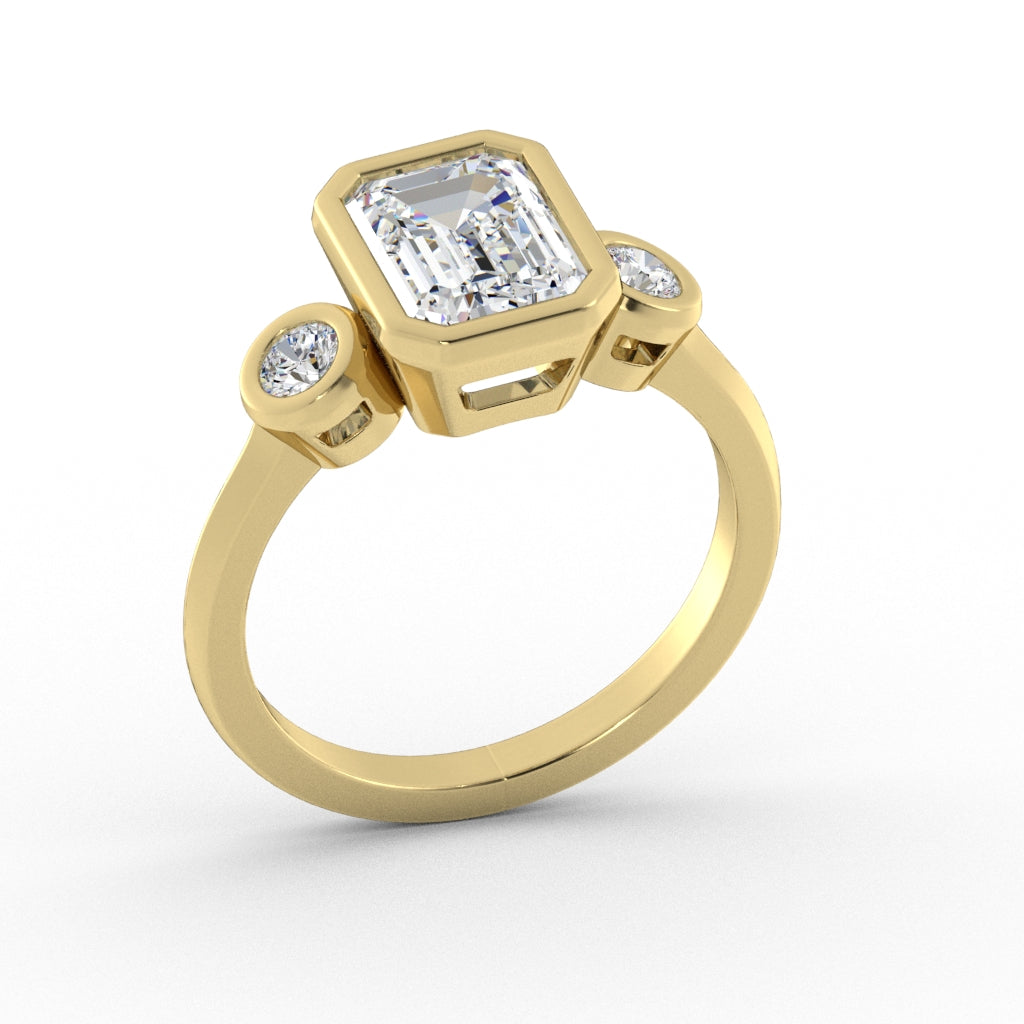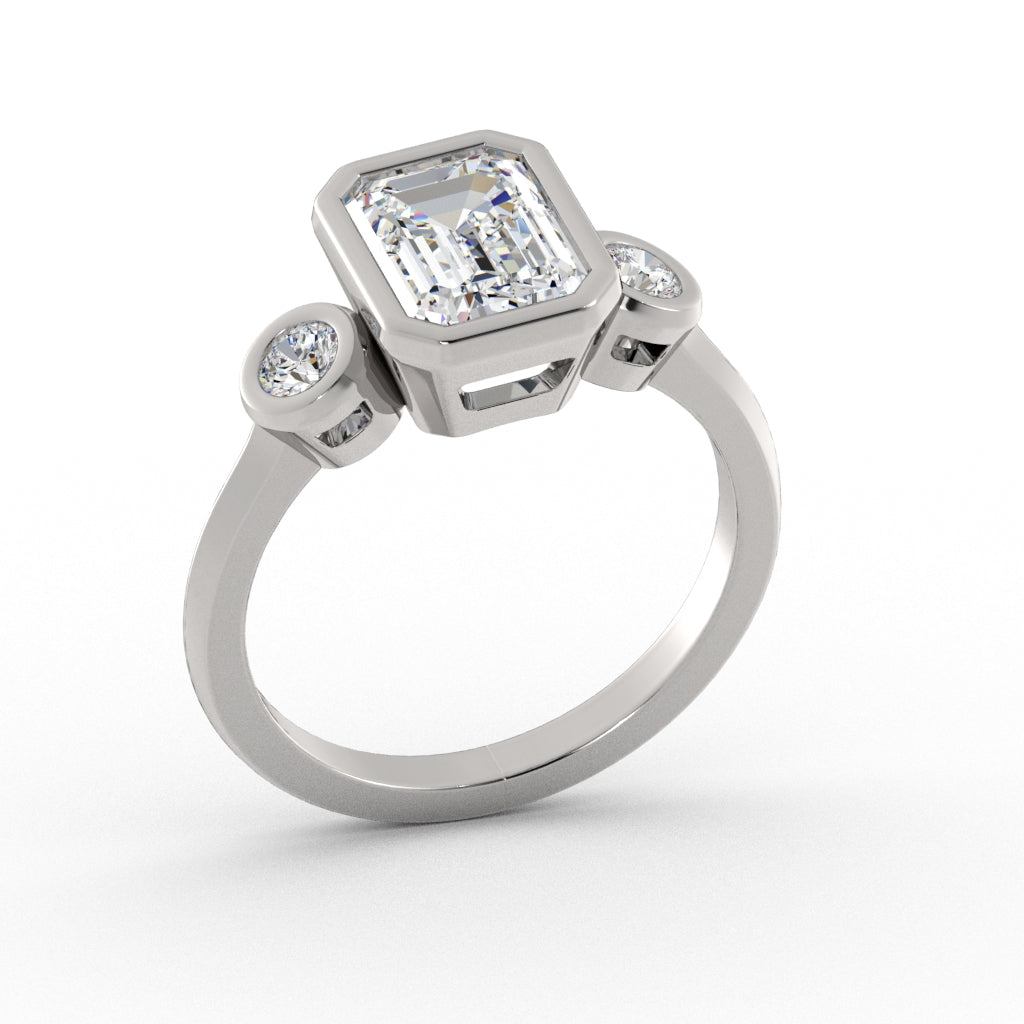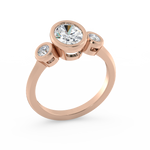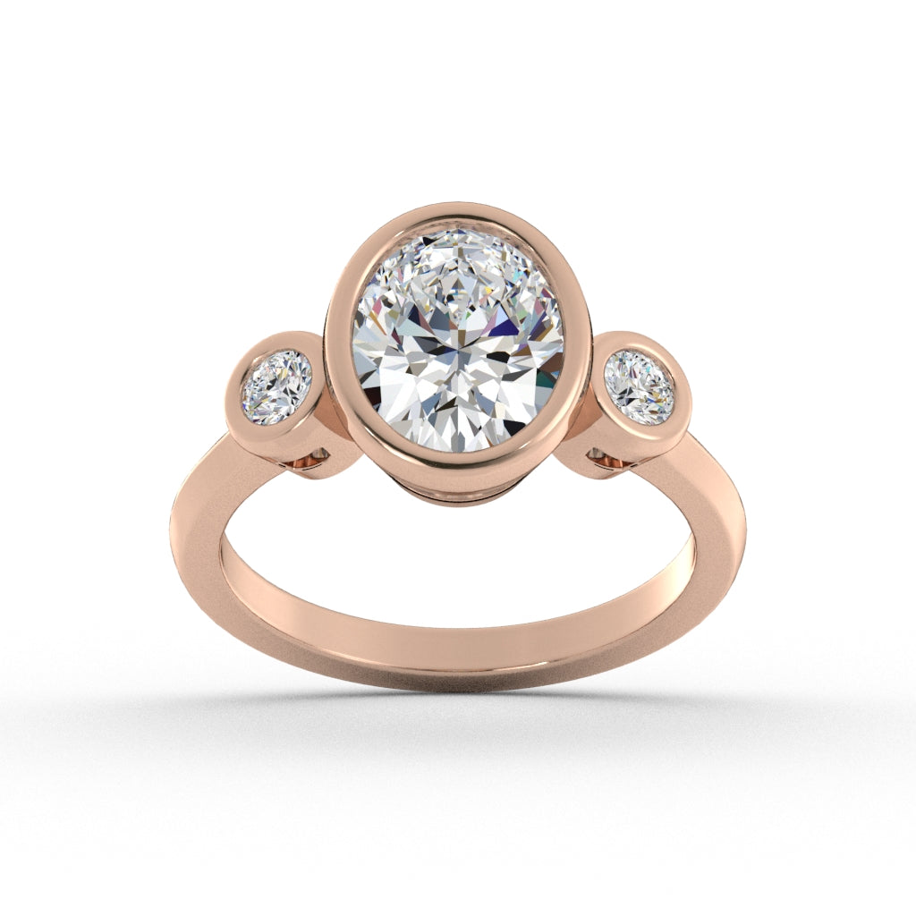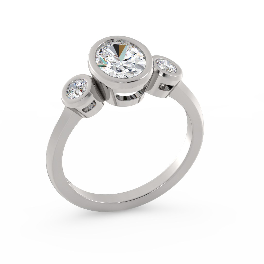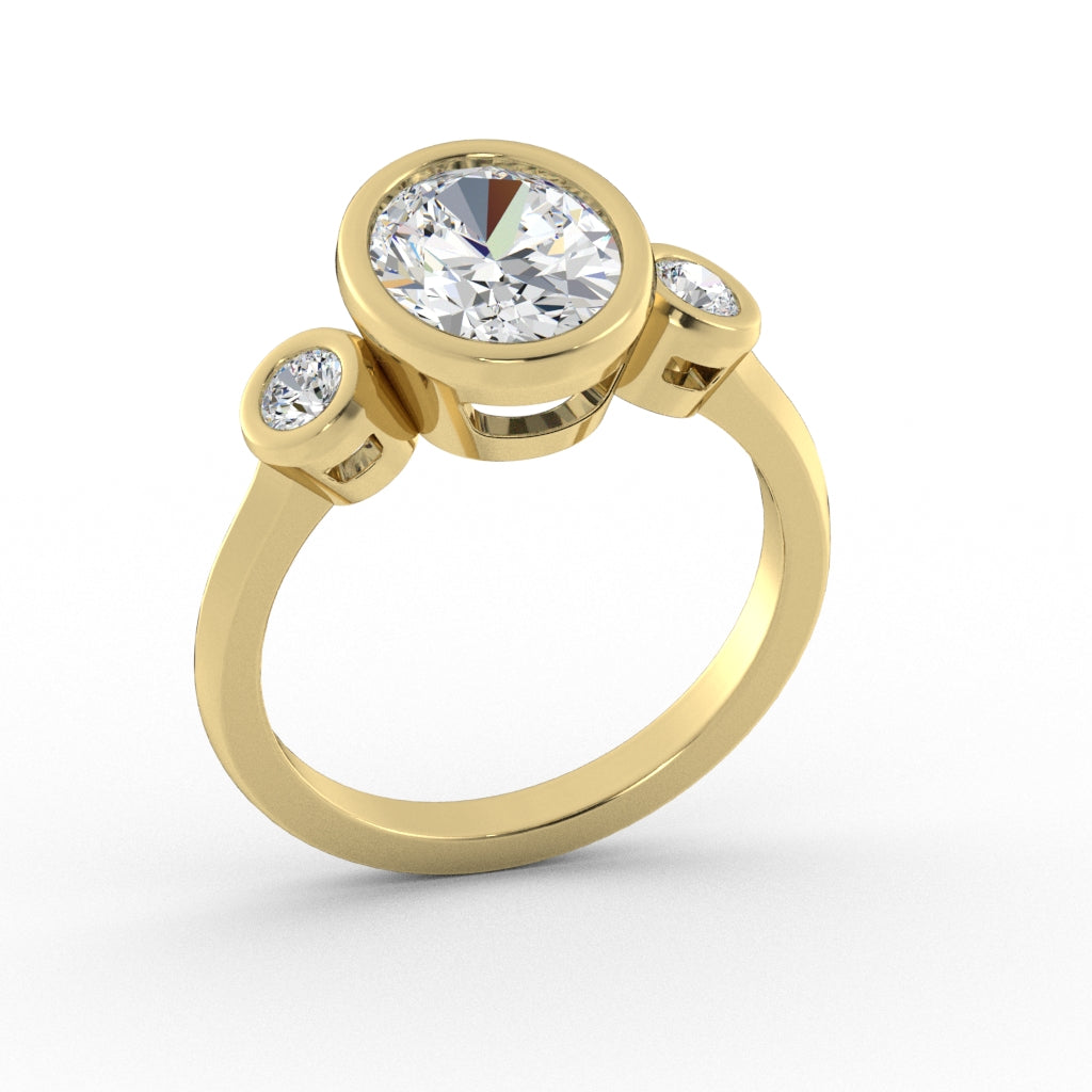 Sleek and modern, this three-stone diamond ring features a captivating round cut diamond at the center, flanked by two smaller round diamonds, all in a secure bezel setting. This ring combines contemporary design with a touch of classic elegance, highlighting the brilliance of each stone. The bezel setting provides a smooth, refined look while offering durability and comfort, making this piece perfect for everyday wear or special occasions. This ring is a beautiful symbol of past, present, and future, celebrating moments that last a lifetime.