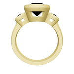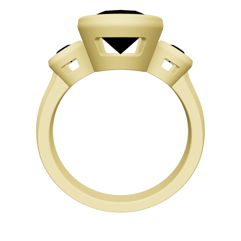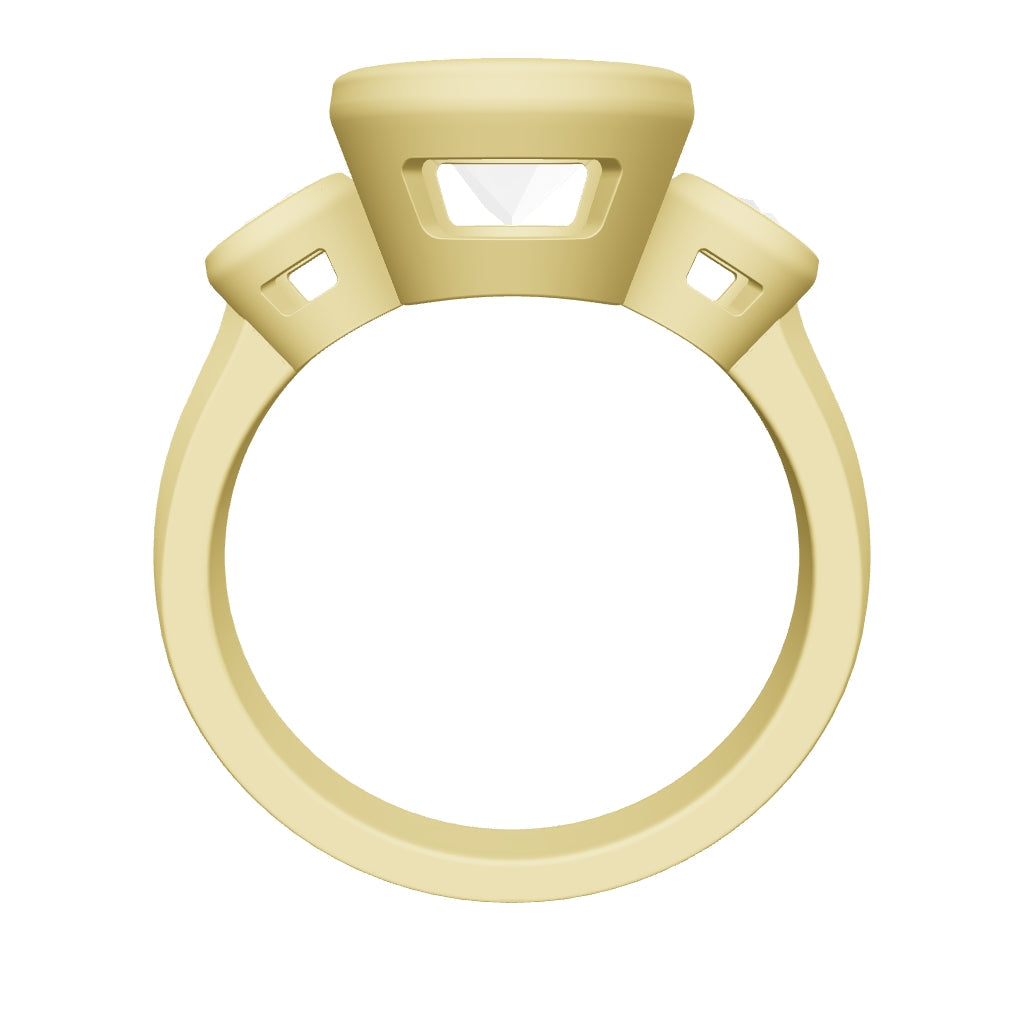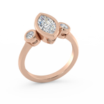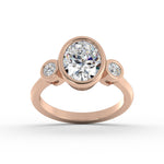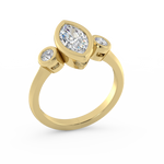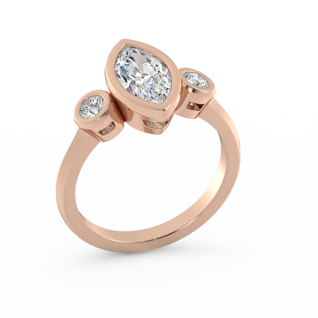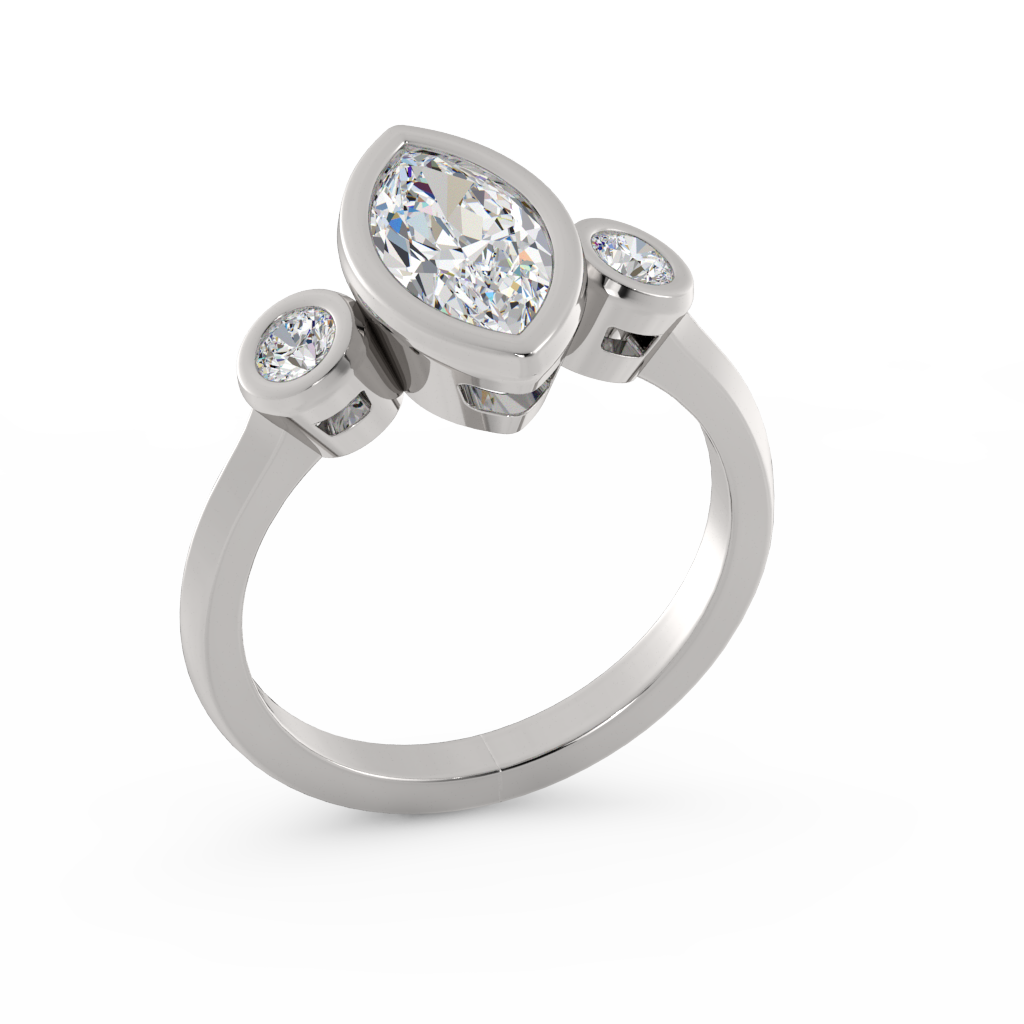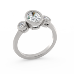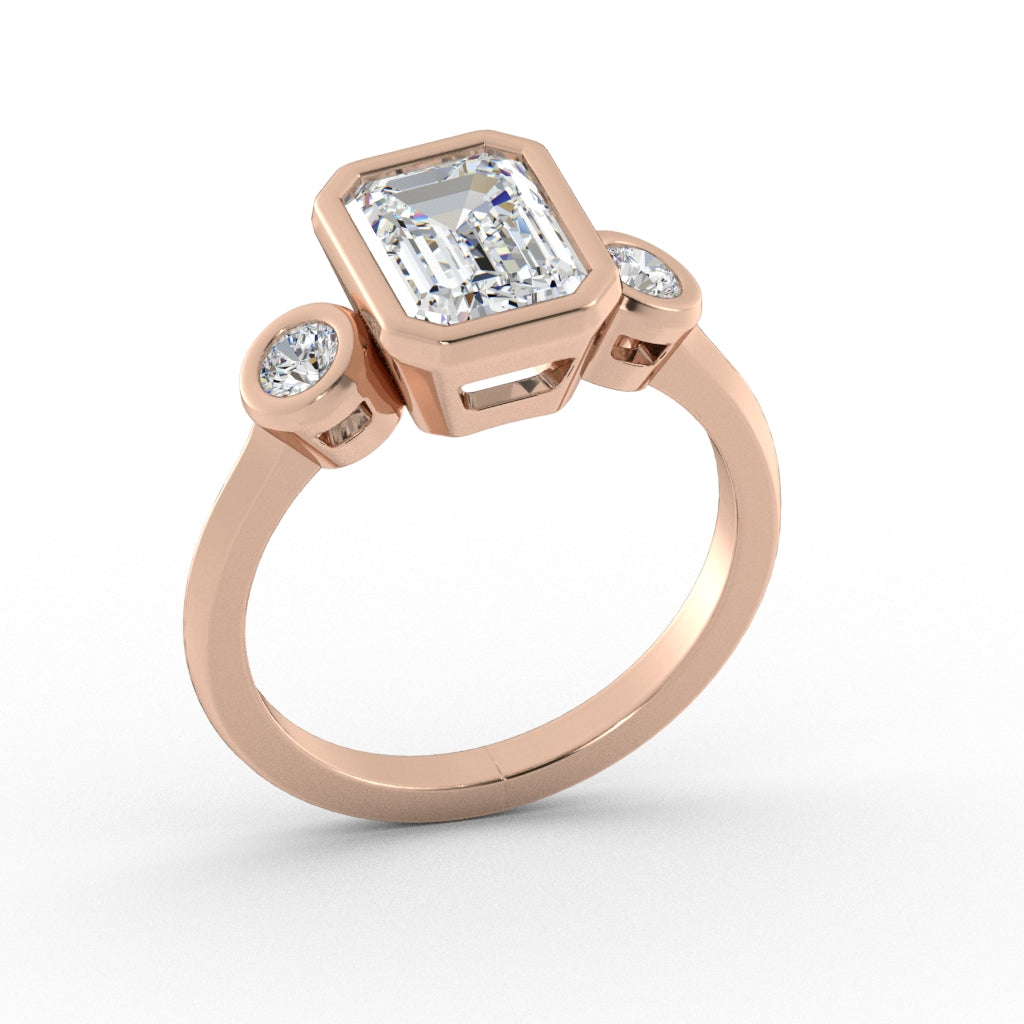 Sleek and modern, this three-stone diamond ring features a captivating round cut diamond at the center, flanked by two smaller round diamonds, all in a secure bezel setting. This ring combines contemporary design with a touch of classic elegance, highlighting the brilliance of each stone. The bezel setting provides a smooth, refined look while offering durability and comfort, making this piece perfect for everyday wear or special occasions. This ring is a beautiful symbol of past, present, and future, celebrating moments that last a lifetime.