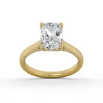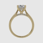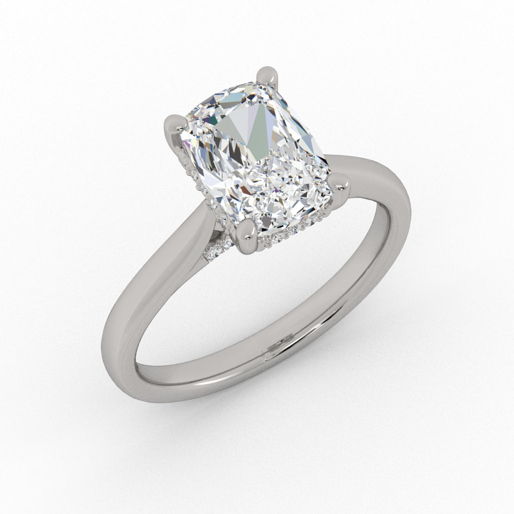A classic cathedral solitaire style engagement ring with a hidden halo and accent diamonds on the bridge.