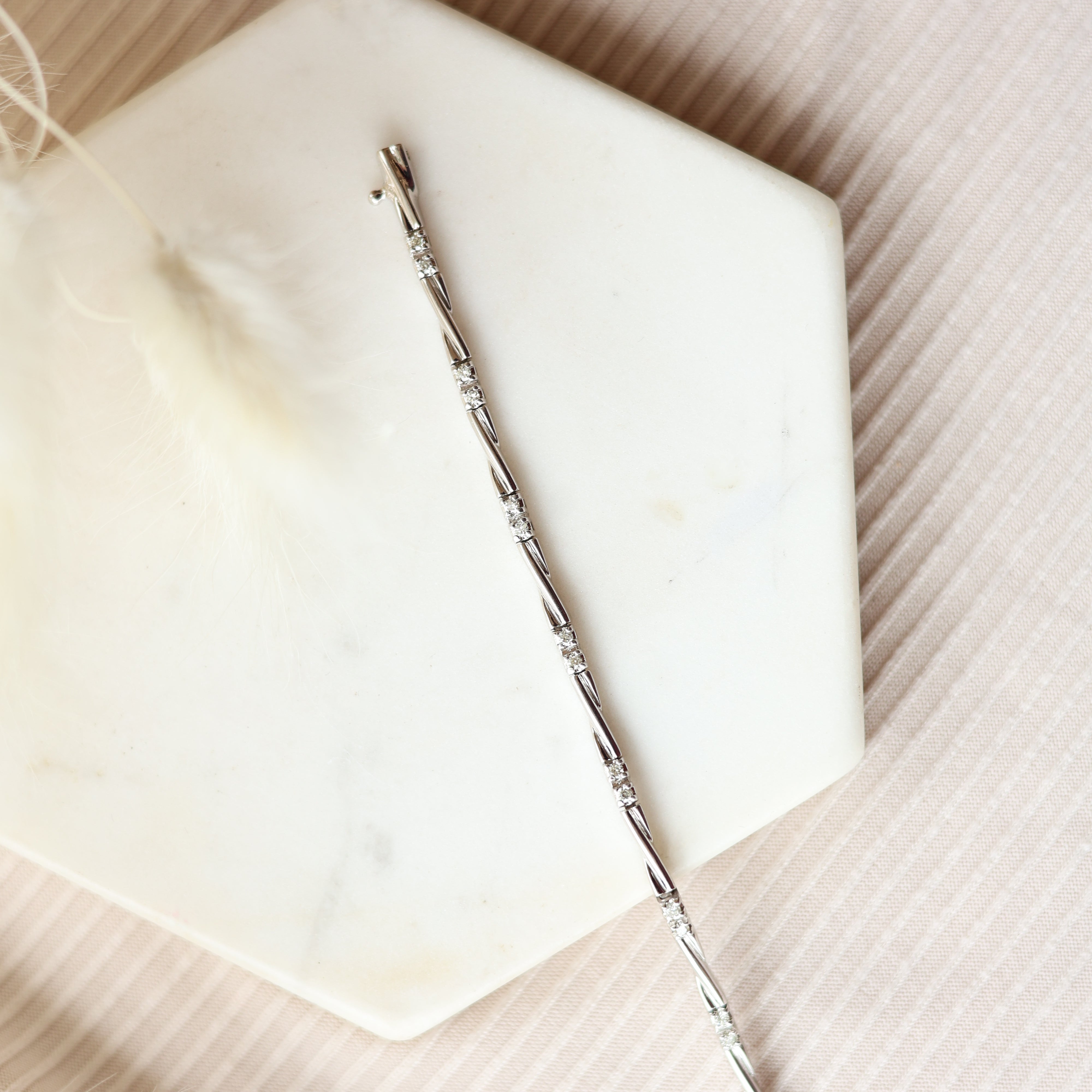14k white gold and 0.75 carat total weight lab-grown diamond tennis bracelet with a safety clasp.