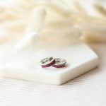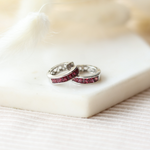 14k white gold channel set natural ruby channel set huggies style earrings.