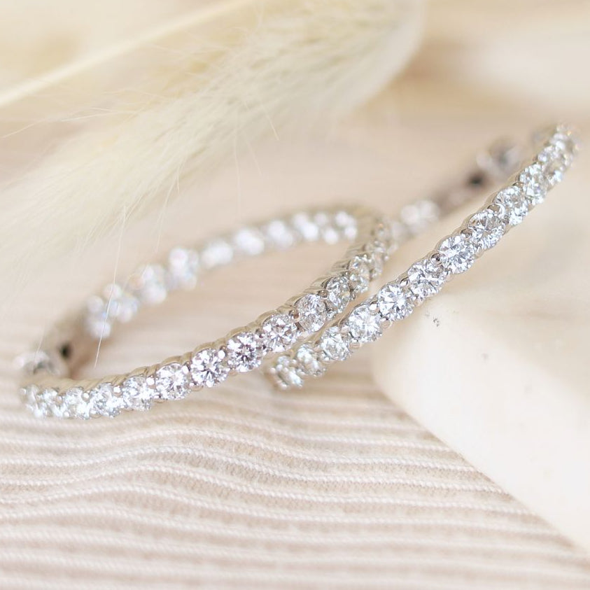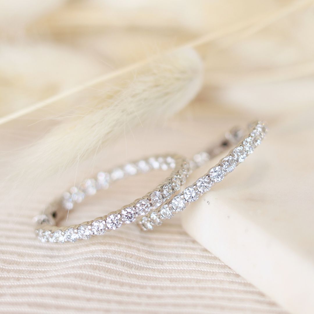 14 karat white gold inside out hoop earrings set with 4.25 carat total weight of round brilliant cut lab-grown diamond.