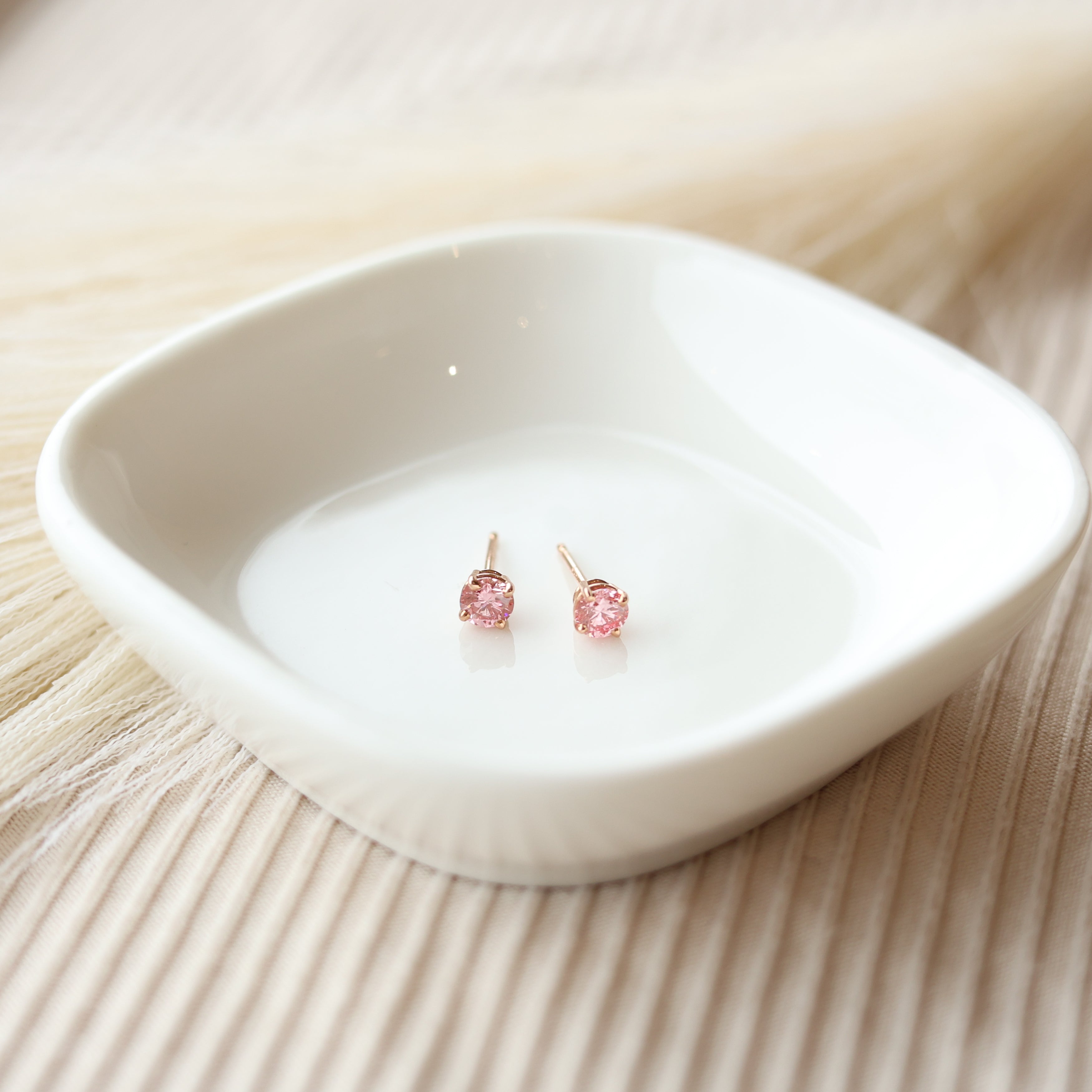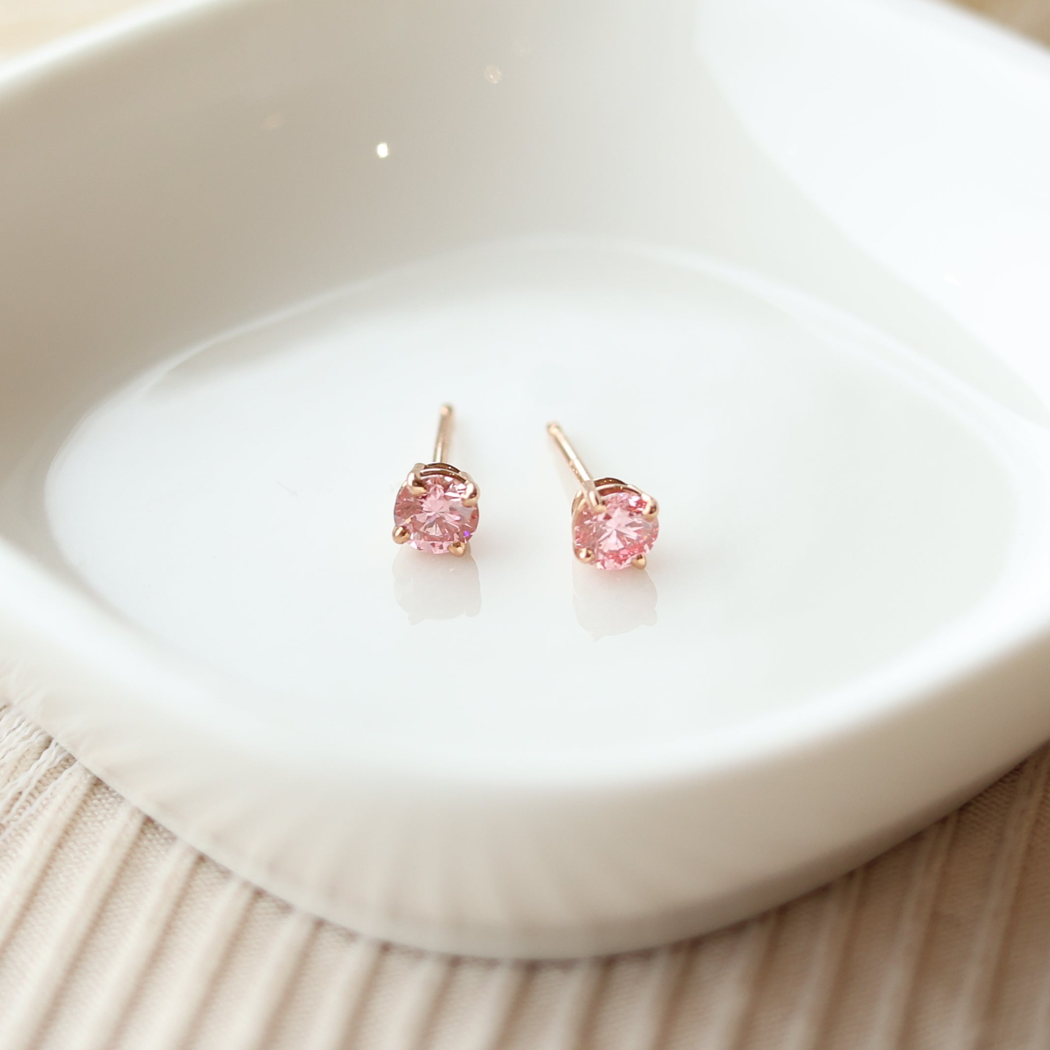 14 karat rose gold round brilliant cut fancy pink lab-grown diamond solitaire earrings with friction backs.