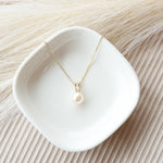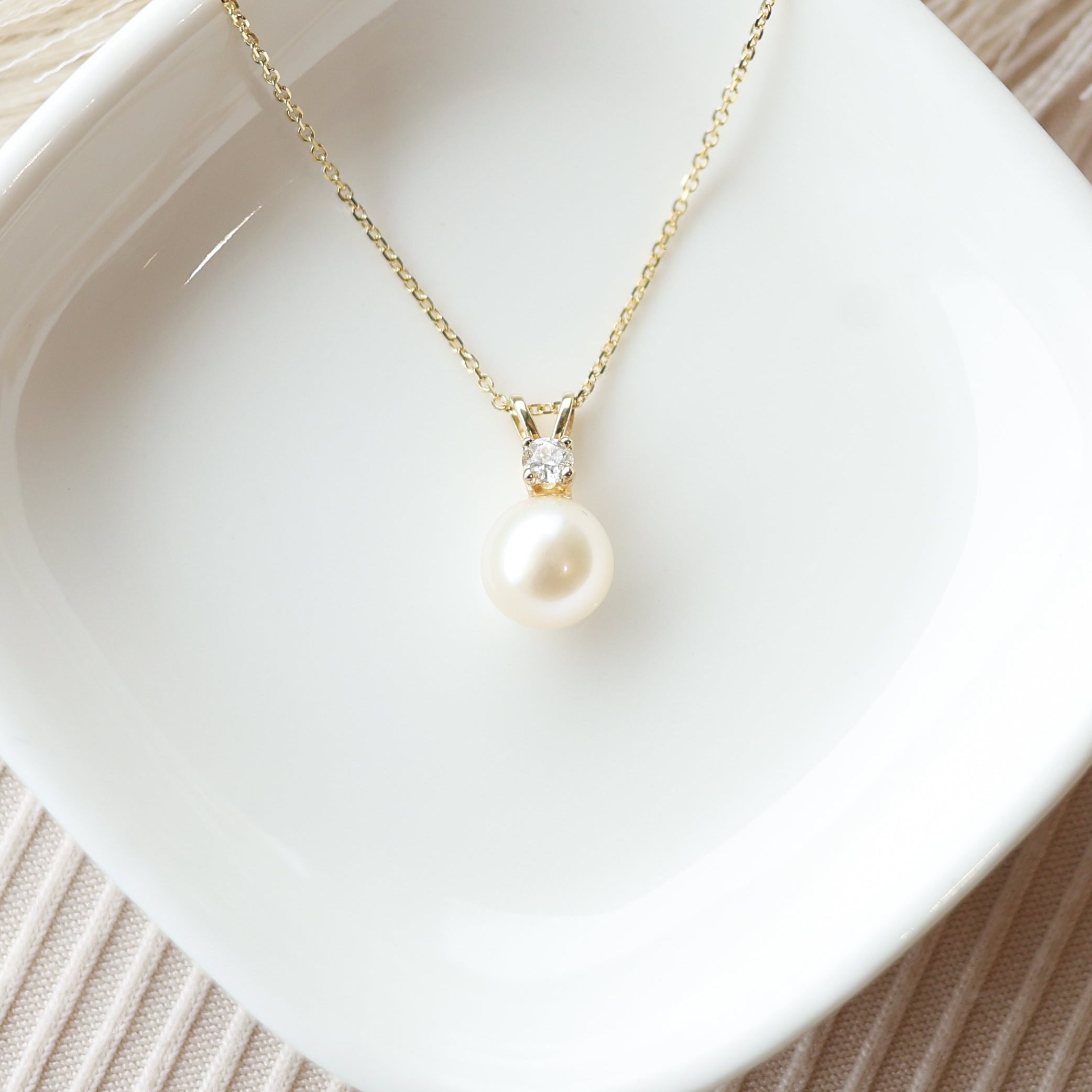 14k yellow gold pearl and diamond pendant on on an 18" stationed adjustable .95mm cable chain.