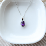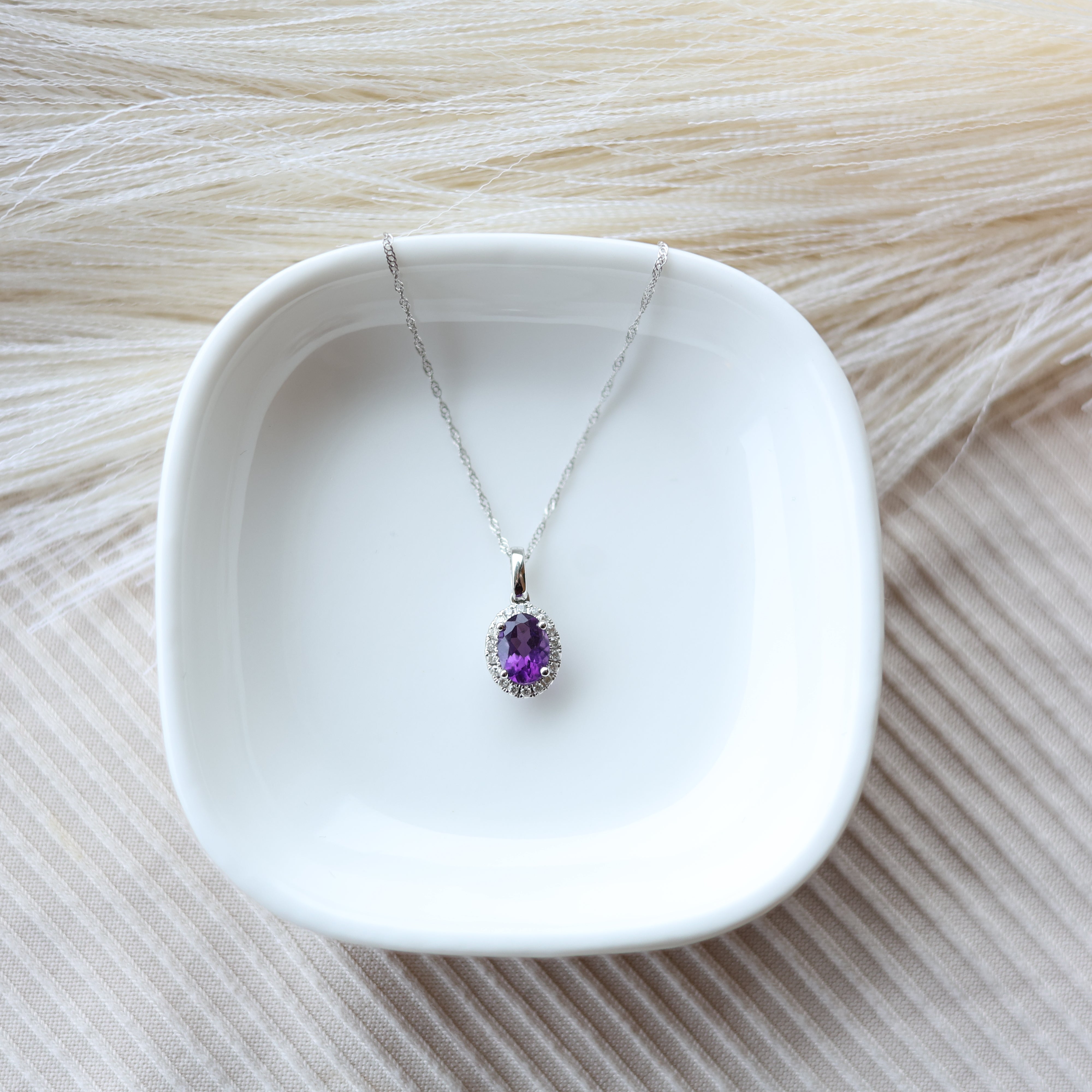 14 karat white gold Amethyst and round brilliant cut natural diamond (.10 carat tw) halo pendant on an 18" chain.