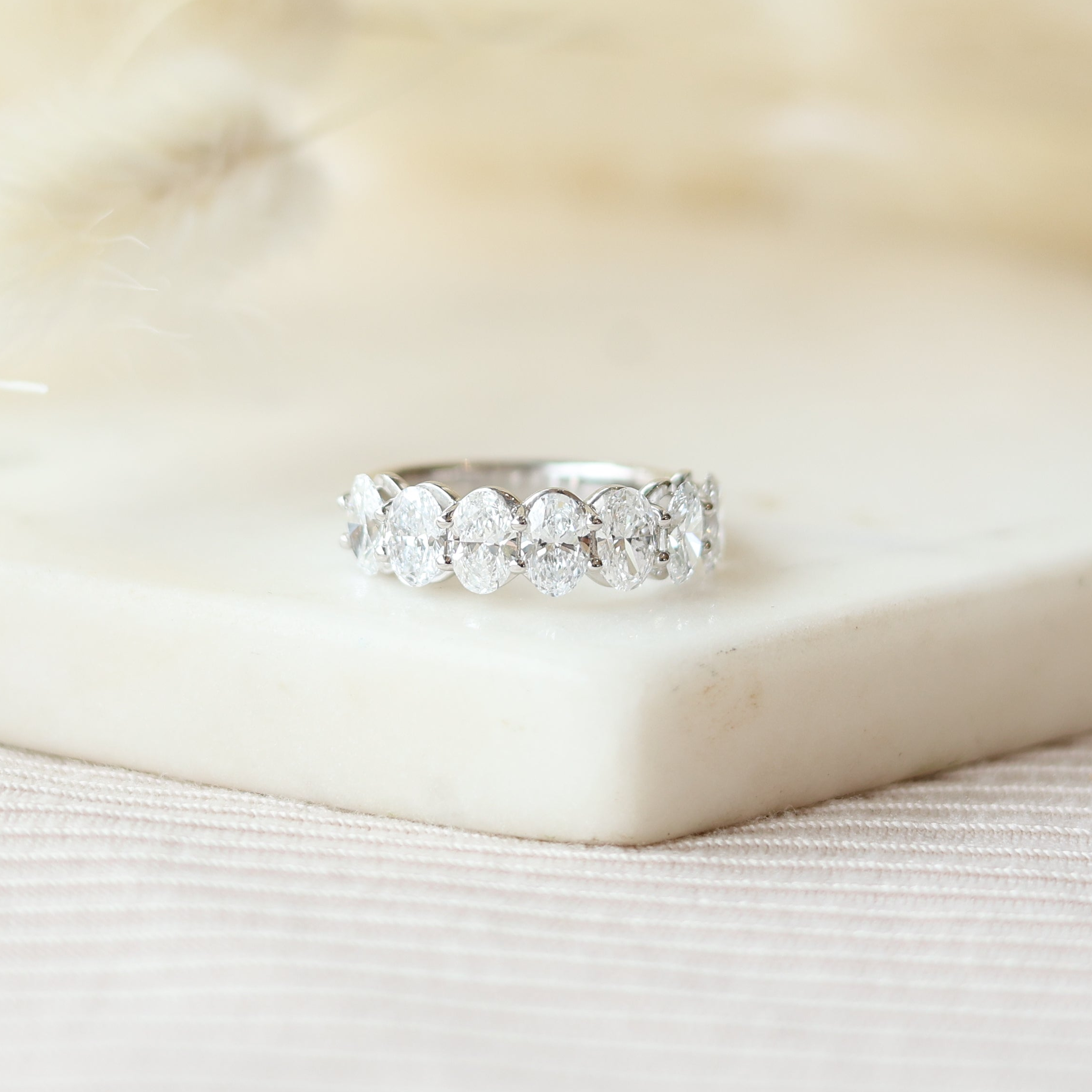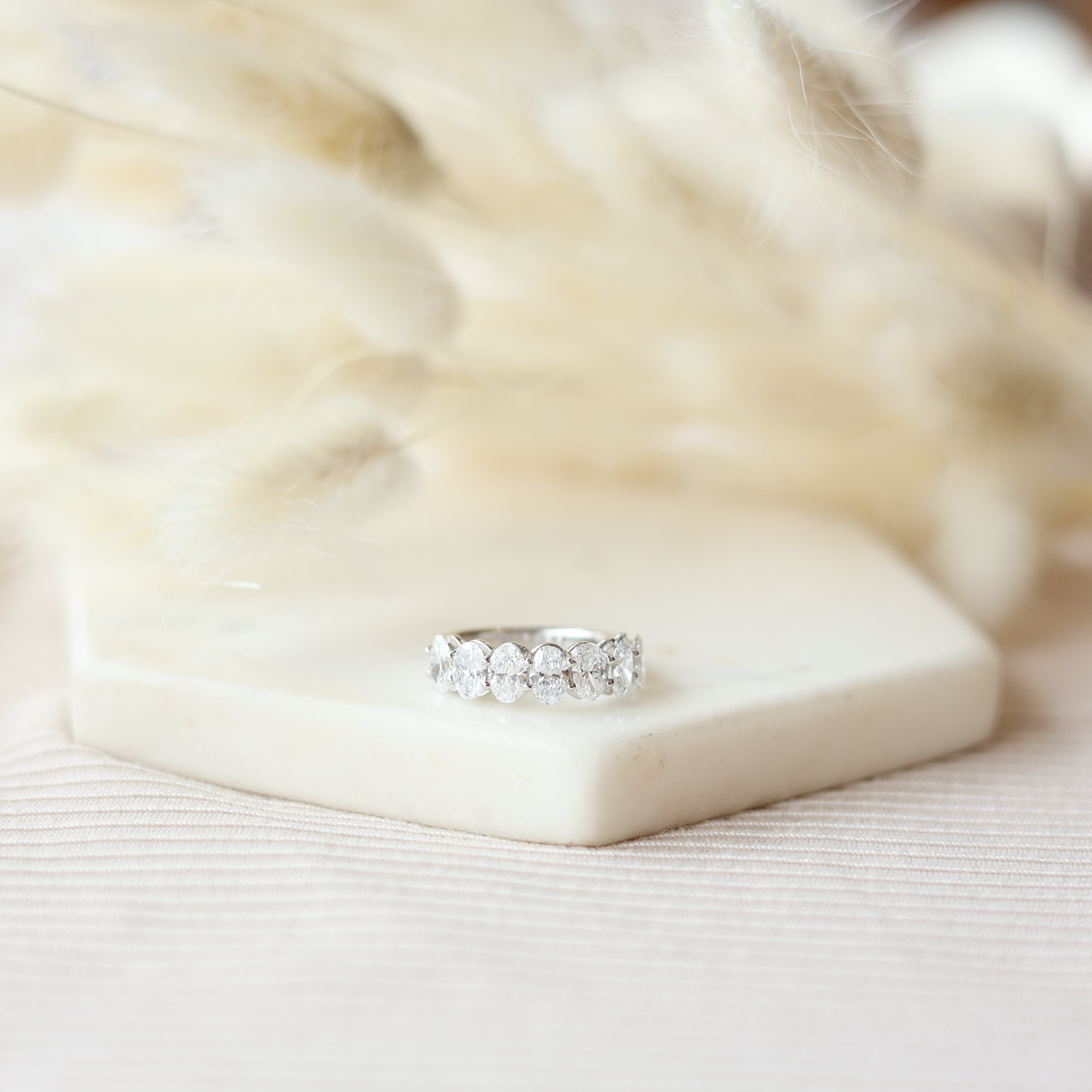 14k white gold diamond ring with seven oval brilliant cut lab-grown diamond ring.