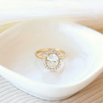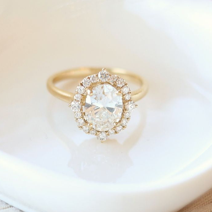 14k yellow gold diamond ring with 1.58 carat oval brilliant cut lab-grown center and natural diamond halo.