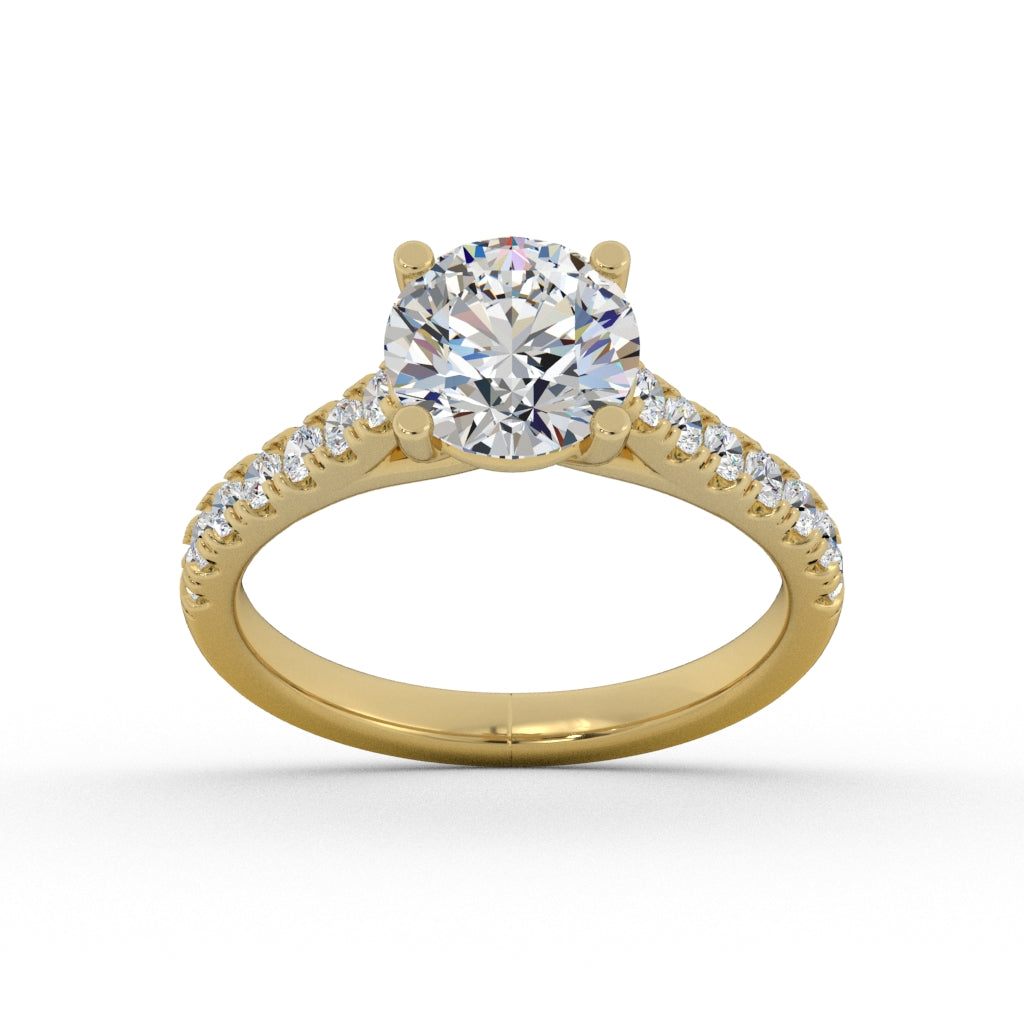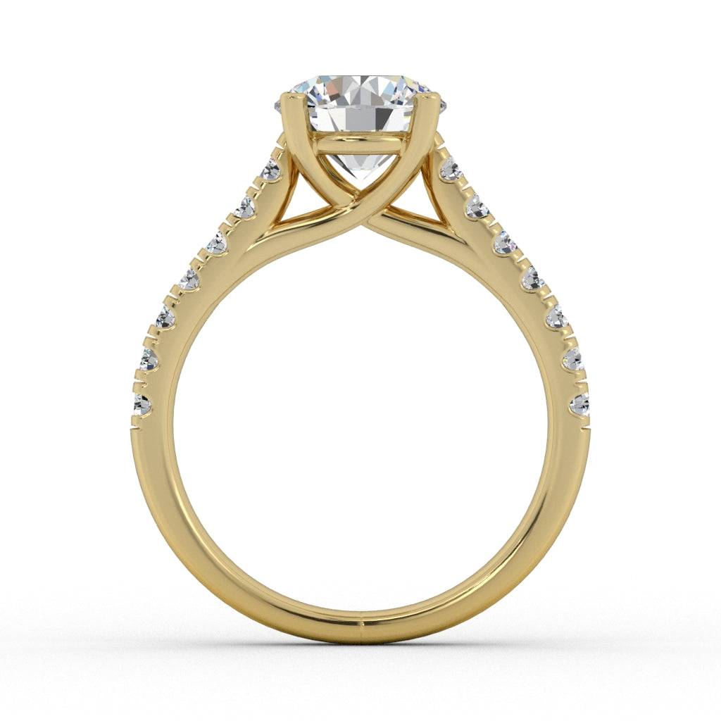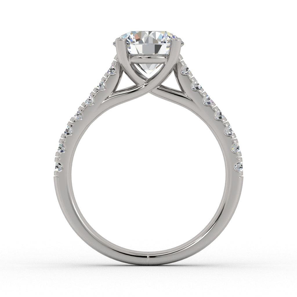 Classic Engagment ring with weaved section and round diamonds on side.