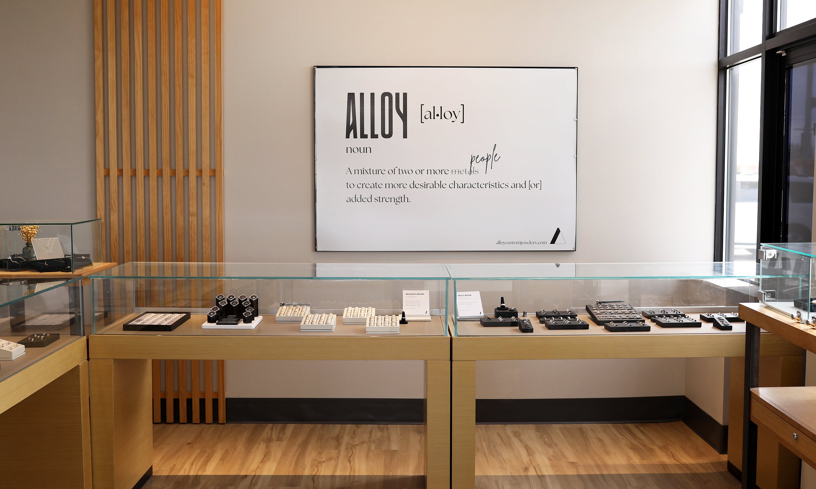 What sets Alloy apart is our commitment to quality and sustainability, using ethically sourced materials and recycled metals—all crafted in our onsite studio. We invite you to visit our cozy showroom, or if you prefer, you can schedule an online consultation. Our friendly team is ready to help you design the perfect piece in a comfortable, welcoming atmosphere.