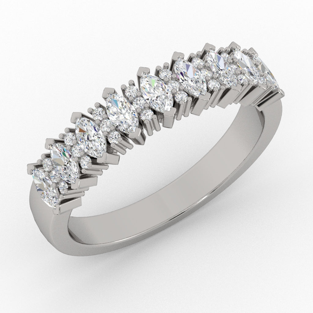 A combination of marquise and rounds create a unique wedding band.